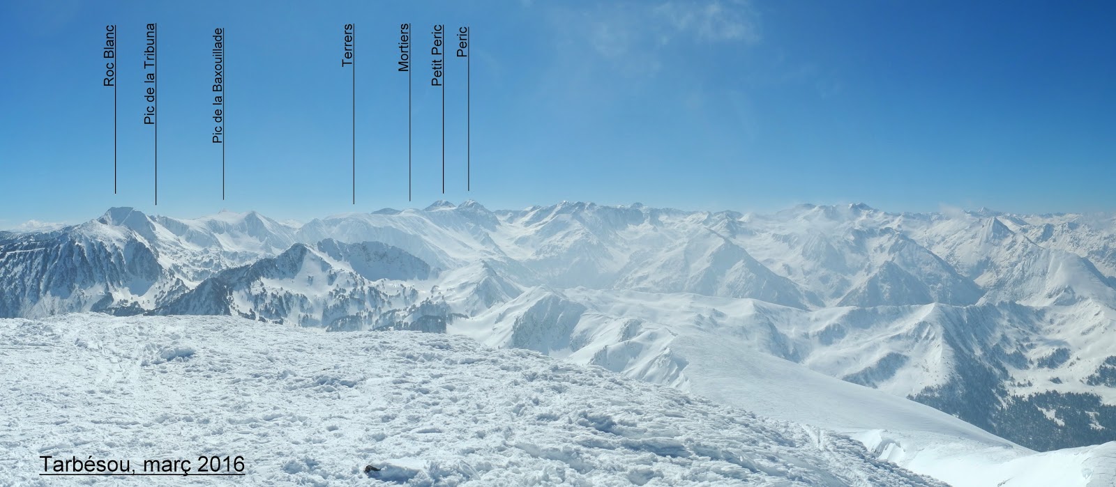 Després de les darreres nevades la muntanya està força bé per practicar l'esquí i hem aprofitat per fer aquest cim, d'una altitud modesta però molt esquiable. Precisament la seva poca altitud fa que sigui recomanable després de nevades intenses, com és el cas, ja que en cas contrari hi pot haver poca neu. El punt de partida és l'estació d'esquí de Mitjanès, on hem arribat després d'un llarg viatge passant per la Cerdanya i travessant el Capcir i el poble de Quérigut. Feia molt fred (el termòmetre del cotxe marcava -8º) i un vent intens. La part alta de la muntanya es veia a estones emboirada, de manera que en algun moment hem pensat que se'ns complicaria l'activitat. Hem iniciat l'ascensió per les pistes però ben aviat les hem deixat enrere pujant per una vall força planera, veient al fons, el Tarbesou, totalment blanc. Hem passat per una petita cabana de pastors i hem seguit pujant sense massa dificultat. Més endavant hem trobat una àmplia canal, més dreta, que hem superat amb unes quantes llaçades. Més amunt ja es veia ben a prop, la carena sudest del Tarbésou; ens hem enfilat a la carena, més amunt del coll i hem seguit pujant, cada vegada amb més pendent però sense massa problema. Finalment hem arribat al cim del Tarbésou (2.364 m), un cim no gaire alt però amb una gran panoràmica sobre les muntanyes de l'Ariège. Al cim el vent era molt fort i gelat, de manera que ens hi hem entretingut poc. Només hem fet les fotos del cim i una panoràmica circular: