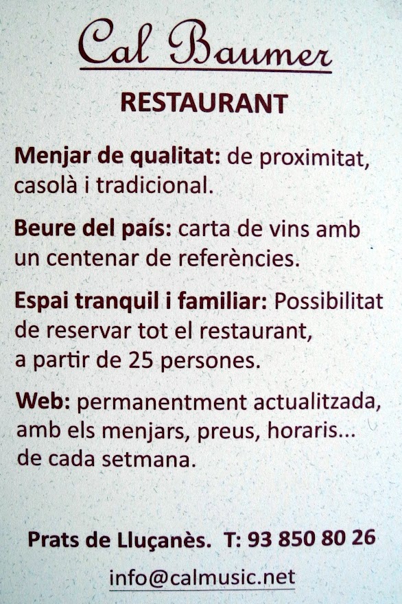 EL DINAR: avui el dinar ha estat més extraordinari que en ocasions anteriors. El restaurant on hem dinat, que a més es hostal rural, ens ha ofert un menú d'especialitats de cuina tradicional que ens han agradat molt. De primer plat hi havia els pèsols estofats amb botifarra del perol la coca de pa sucada amb tomàquet i encenalls d’espatlla ibèrica de gla i el trinxat del Lluçanès. De segon, peus de porc amb cargols i samfaina, pilotilles de porc i vedella amb peres i pollastre de Berguedà rostit a la cassola. Després postres diversos, tots casolans, cafè i, per acabar, un xupito de diversos licors artesanals.